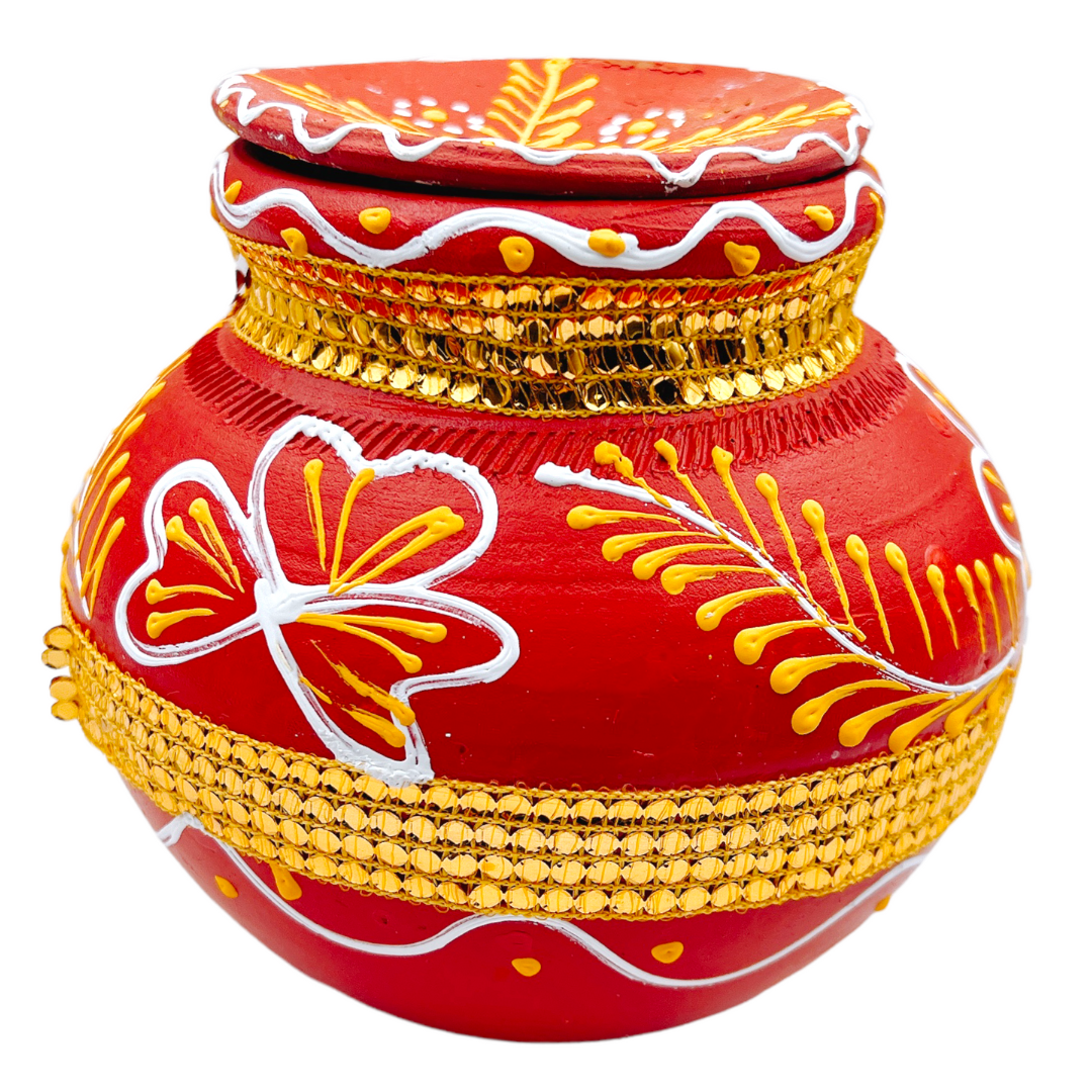 It is an ancient tradition to pray every day. A clay pot is an integral part of a person's puja (prayer) kit. Make sure you have one before karava chauth, so you can partake in this holy and auspicious occasion. Our decorated pot has nariyal/coconut on top of it is adorned in beautiful red cloth and bright decorations. Perfect for karva Chauth, hoi, Navratri and Diwali.