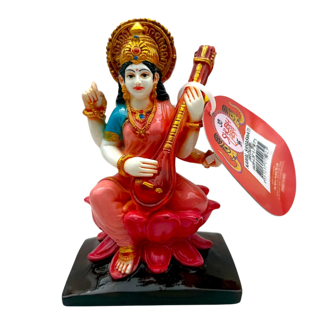Invite wisdom, learning, and artistic inspiration into your space with this beautifully designed Kamal Saraswati Idol. Featuring Goddess Saraswati seated on a blooming lotus while playing the veena, this statue symbolises purity, knowledge, and creativity—perfect for students, teachers, and devotees alike.