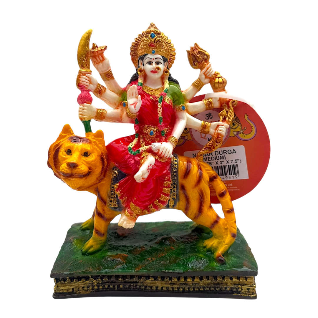 Invoke divine strength and fearless protection with this beautifully crafted Nagar Durga / Shera Wali Mata idol. Seated majestically on her tiger, Maa Durga is depicted with multiple arms carrying symbolic weapons, radiating power, grace, and divine energy. Painted in vibrant hues of red, gold, and green, this idol is a symbol of Shakti (strength) and triumph over evil.