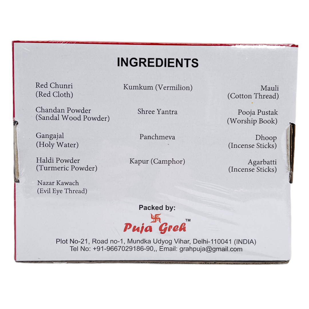 Red Chunri (Red Cloth), Kumkum (Vermilion), Mauli (Cotton Thread), Chandan Powder (Sandal Wood Powder), Shree Yantra, Pooja Pustak (Worship Book), Gangajal (Holy Water), Haldi Powder (Turmeric Powder), Nazar Kawach (Evil Eye Thread), Panchmeva, Dhoop (Incense Sticks), Agarbatti (Incense Sticks), Kapur (Camphor)