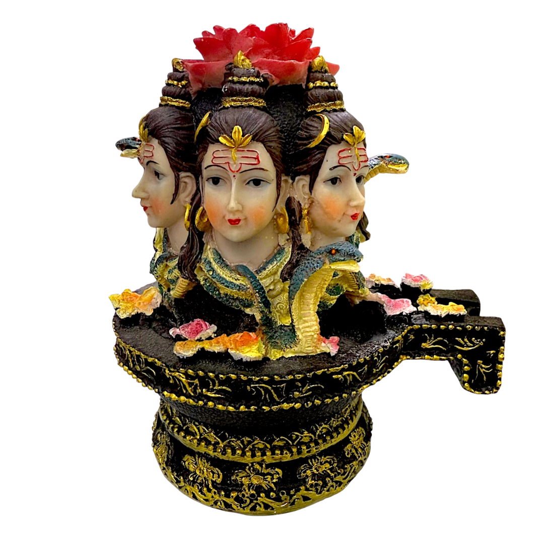 Spiritual Design: Trimurti Shiva atop a Shivalingam signifies balance, destruction of negativity, and eternal energy