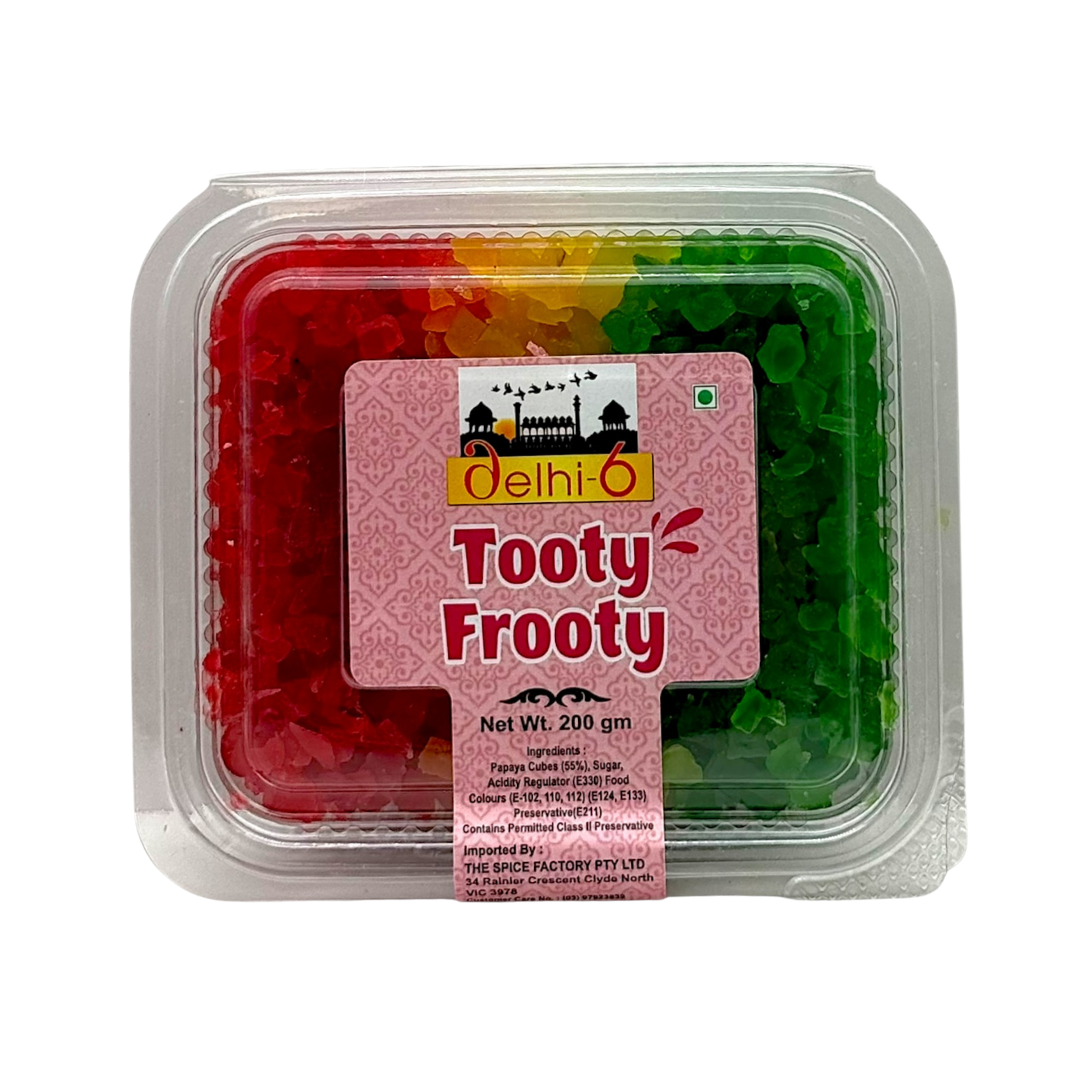 Bring colour and sweetness to your desserts with Delhi 6 Tutti Fruity Mixed, made from premium raw papaya pieces. This vibrant mix of red, green, and yellow candied bits is perfect for adding flavour and a festive touch to baked goods, sweets, and traditional Indian recipes.