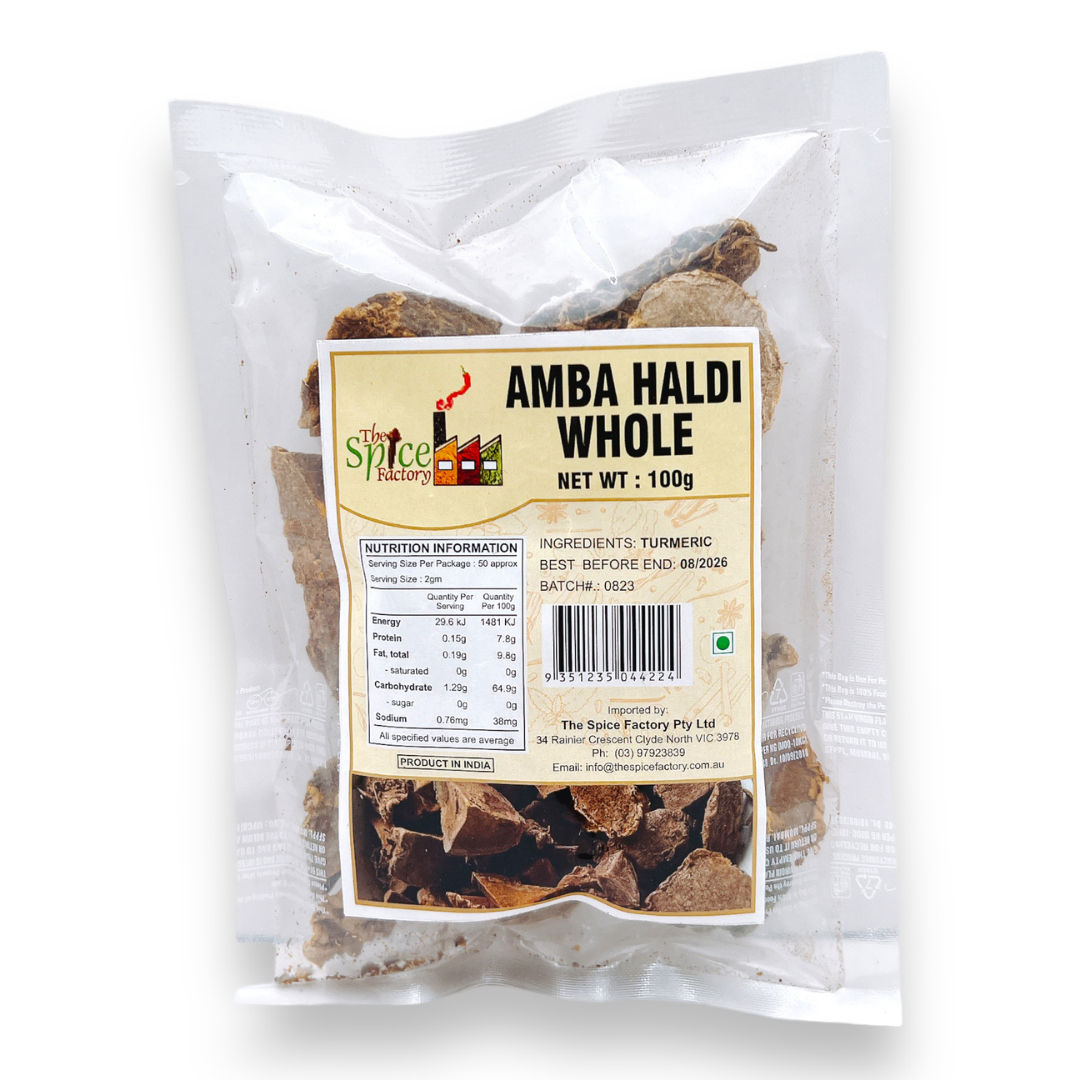 - Amba Haldi, also known as Mango ginger, is Curcuma amada. It is an Ayurvedic spice used to treat joint pain, itching in the skin, indigestion, cough and wounds.