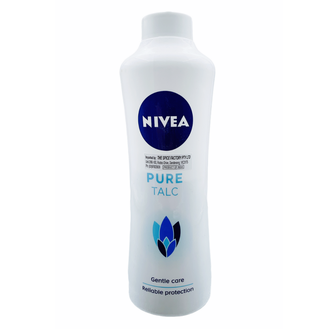 Nivea Pure Talc is a fragrant powder that helps keep skin dry, soft, and smooth. It is a finely milled talcum powder that is marketed as being ideal for use after showering or bathing, or at any time when the skin needs to be refreshed.