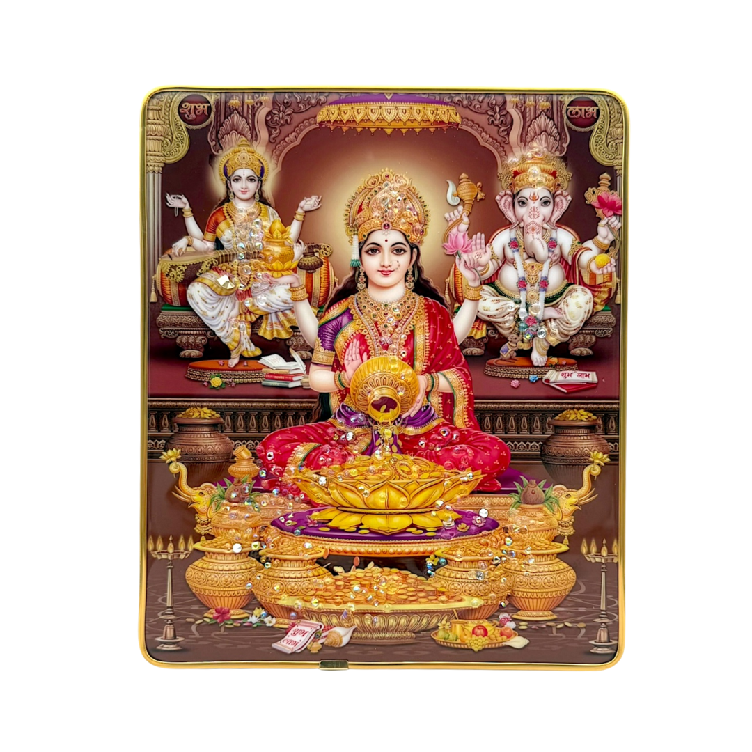 Design: Elegant artwork of Lakshmi, Ganesh, and Saraswati in a golden prosperity theme