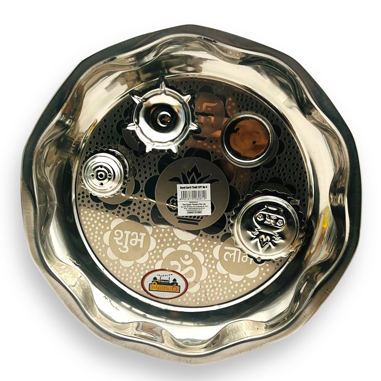 Printed Steel Aarti Thali is a traditional religious accessory that holds great significance in Hindu rituals and ceremonies. It is an elegantly designed plate made of high-quality stainless steel, adorned with intricate prints and patterns. The term "aarti" refers to a Hindu ritual where a plate, known as a thali, is used to hold various items for worship.