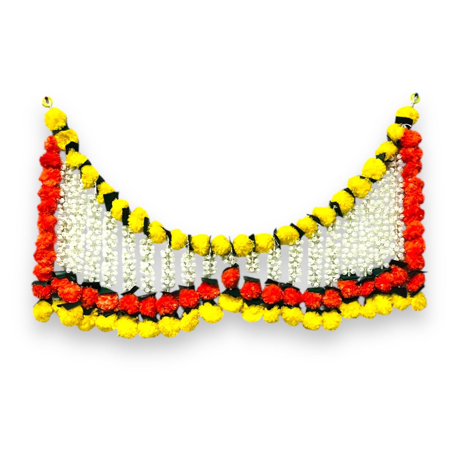 A Flower Hanging Toran is a traditional and decorative element used in various cultures, especially in South Asia, to adorn doorways and entrances during festive occasions. The term "Toran" originates from Sanskrit and refers to a decorative door hanging or festoon. These floral hangings are often crafted with a combination of vibrant and fragrant flowers, leaves, beads, and other ornamental elements.