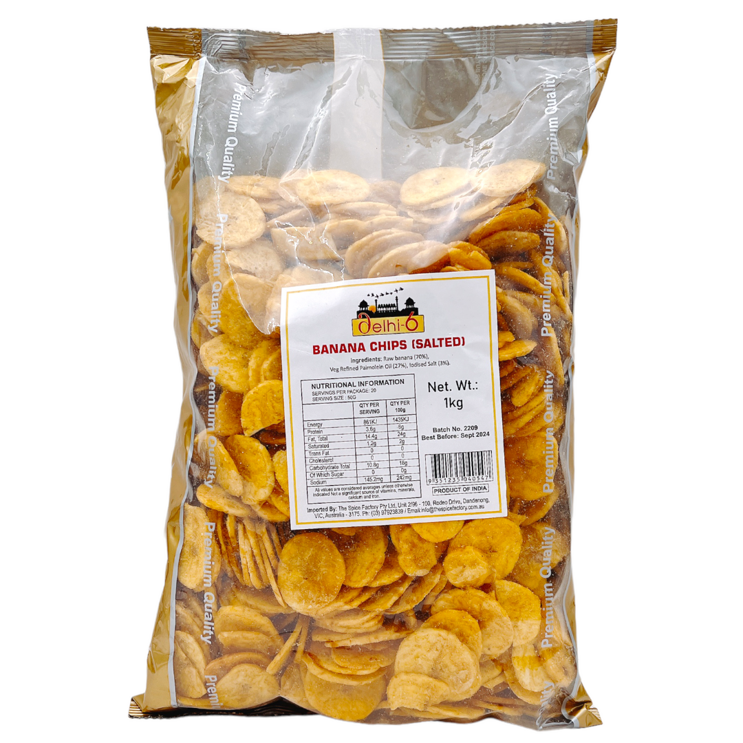 Delhi-6 Banana chips or banana wafers, are a popular snack made from thinly sliced bananas that are typically deep-fried or baked until they become crispy and golden brown. One popular variation of banana chips is salted banana chips, which are seasoned with salt to enhance their flavor. These savory snacks are enjoyed by people around the world for their unique taste and crunchy texture.