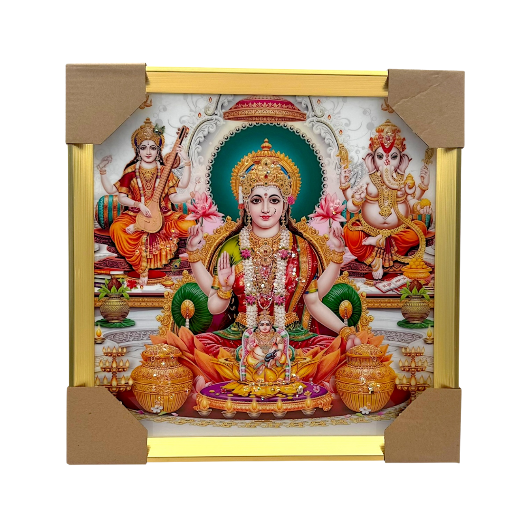 Enhance your spiritual space with this Lakshmi Ganesh Saraswati Photo Frame – Marble Look Divine Edition. Featuring the holy trio of Goddess Lakshmi, Lord Ganesha, and Goddess Saraswati set against an elegant marble-look backdrop, this frame is perfect for adding a touch of serenity and divine grace to your pooja room, living area, or office.